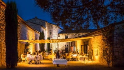 château sous le velum, devant les vignes.Les menus et les plats ainsi que leurs prix changent régulièrement.